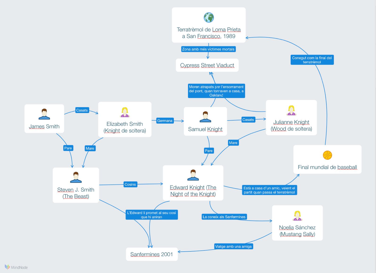 Amb el primer capítol no parlava ni d’un lloc en concret ni d’una data precisa, això jugava al meu favor, però al mateix temps si que estava escrit pensant amb algun lloc dels Estats Units, i la cinquena part estava situada a Múrcia. Després de donar-hi moltes voltes, vaig arribar a la conclusió que el personatge de l’Steven J. Smith del primer capítol no el podia treure del seu context. Vaig pensar que podia buscar una catàstrofe històrica, per situar un familiar seu que pogués acabar lluny d’aquell país. Vaig trobar el terratrèmol de San Francisco del 1989. Concretament amb els fets de Loma Prieta i el Pont de Cypress Street amb 42 víctimes mortals. Aquest era el punt de més víctimes mortals d’aquell terratrèmol, i això donava marge per crear un cosí de l’Steven.
